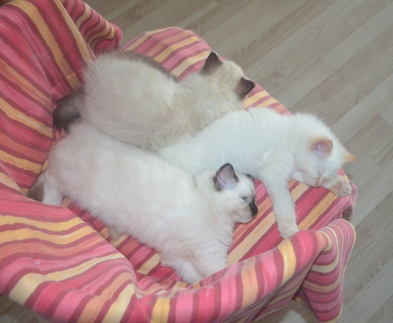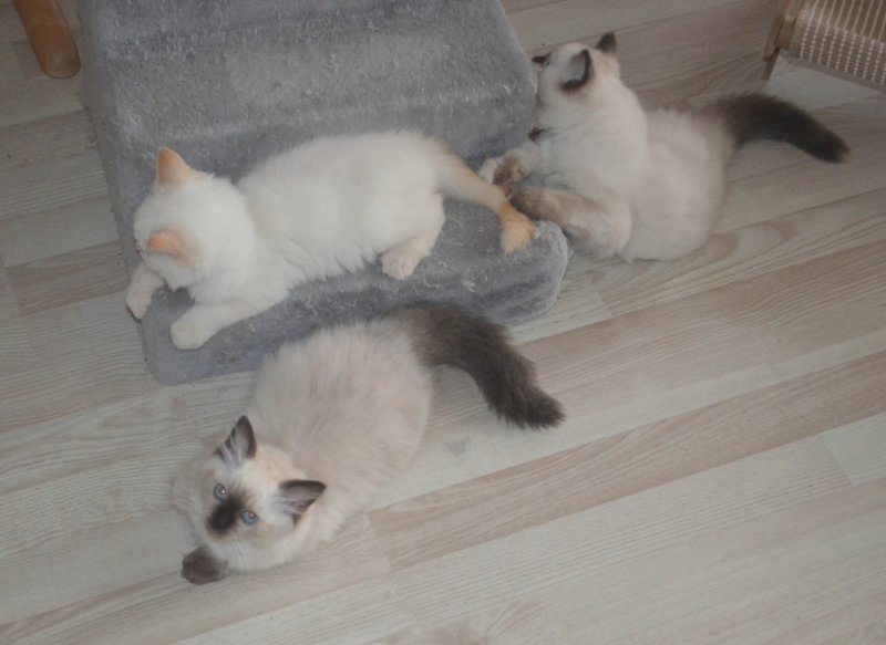Hele kuldet samlet på et sted. Først på stolen, vi bruger til ugens fotosession. Dernæst på gulvet, ved en "trappestige". Det skal lige siges, at Ragdolls ligger meget ofte direkte på gulvet. Det nyder de.