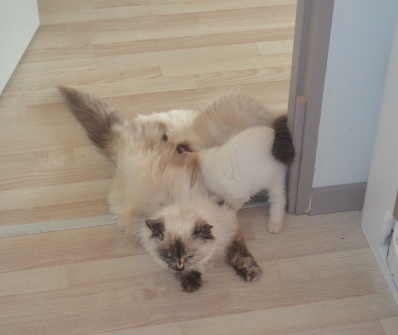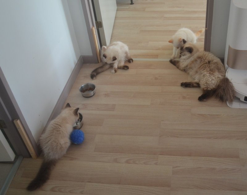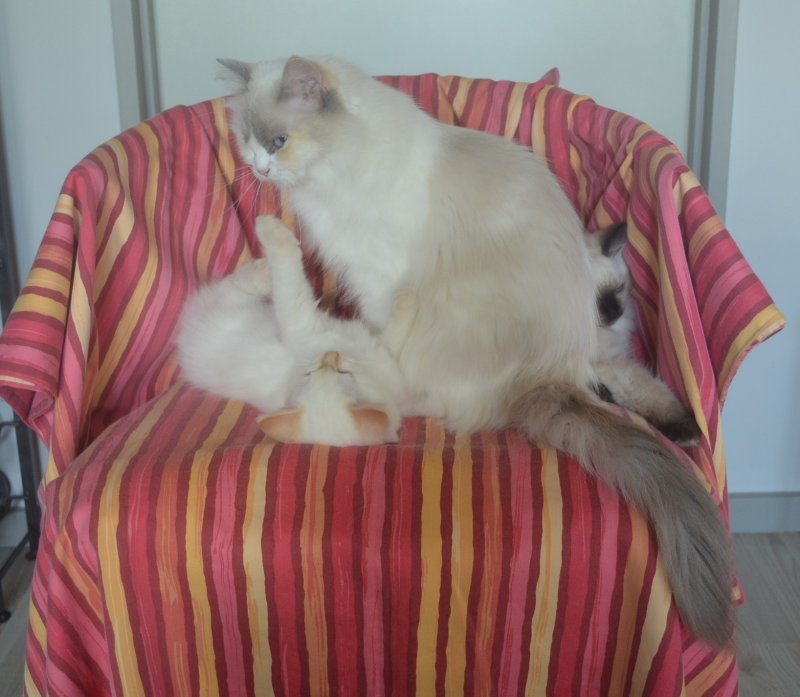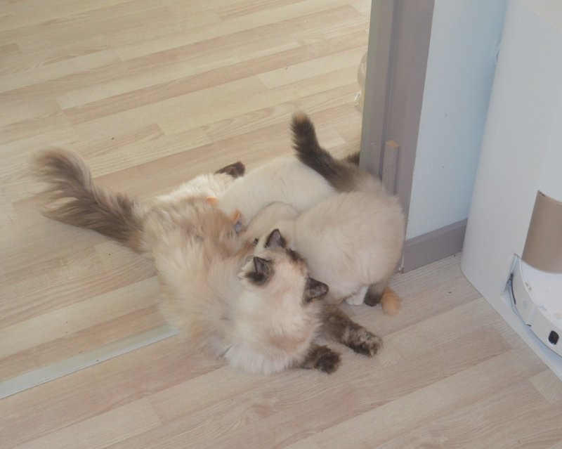 Uha hvor går det pludseligt stærkt. Iberis kuldets 3 killinger har hygget - leget - spist sig igennem den forløbne uge. De har hygget meget sammen med Snorkfrøken, som nu har overtaget opdragelsen af killingerne fuldt ud. Mama Xia gider ikke længere, så hun trækker sig til soveværelset, hvor killingerne ikke har adgang, der kan hun finde ro.