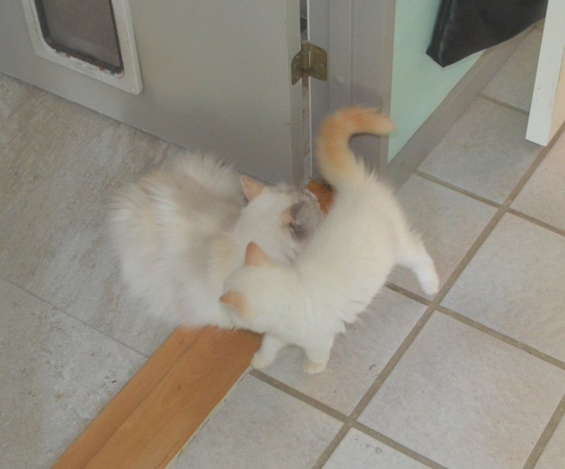 Ugen er sluttet med killingernes andet besøg hos dyrlægen. Besøg som omfattede vaccination for anden gang samt indsættelse af chip. Det var de ikke så glade for, især fordi den dér chip er lidt stor. Men hjemme igen var der ikke noget at mærke på killingerne. de kastede sig straks ud i at lege med hinanden og med Juglans killingerne.