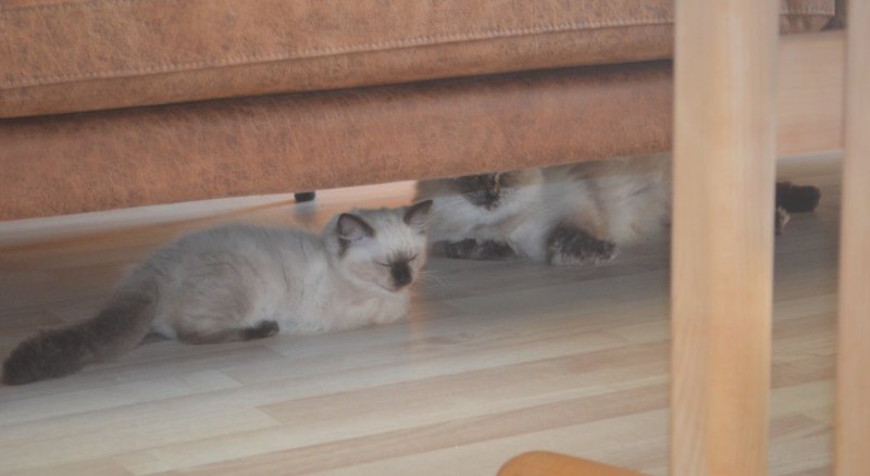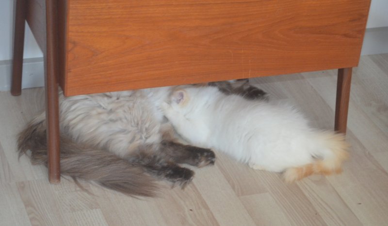 Hvis nogle af vores killingekøbere kommer til at under sig over, hvorfor deres killing ligger inde under sofaen eller lignende, så er det altså noget deres mama Tina Turner har lært dem. Her kan hun lide at ligge og slappe af, og hun har ligget dér mange gange sammen med killingerne under hele deres opvækst.