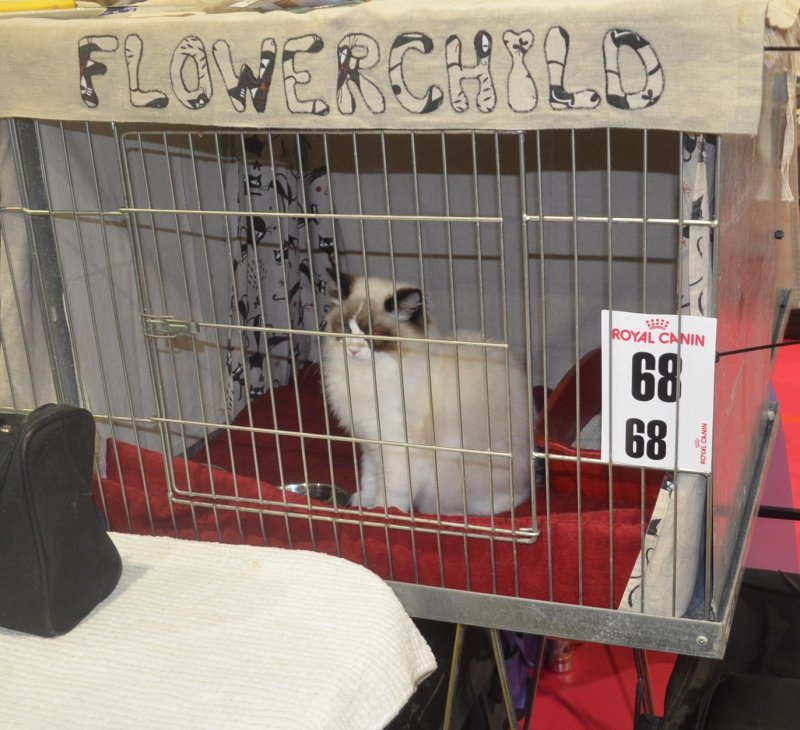 Tina Turner er jo garvet udstillingskat, så hun var meget nem at have med. Cherry Pie derimod har aldrig været på udstilling før, så for hende er det debut på alt. Lang køretur - overnatning på hotel - udstillings hurlumhej. Det var alt sammen lidt overvældende for Cherry Pie, men hun har dog klaret det fint. Det værste var åbenbart køreturen, her snakkede hun det meste af vejen.
